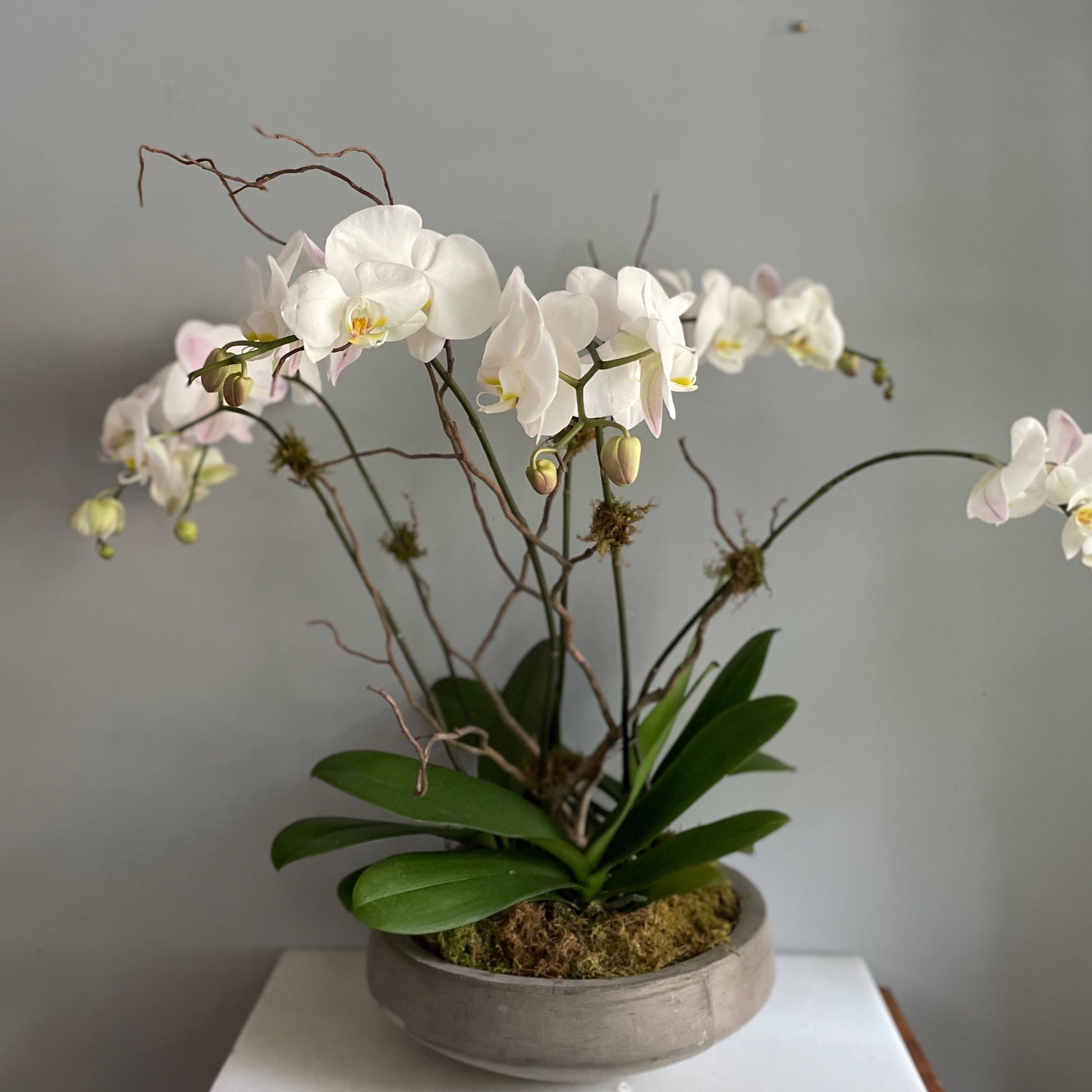 Send your loved one a long lasting orchid planter. Each one is artfully designed with multiple stems of phalaenopsis orchid planted in a stunning planter. Accented with natural moss and branches.